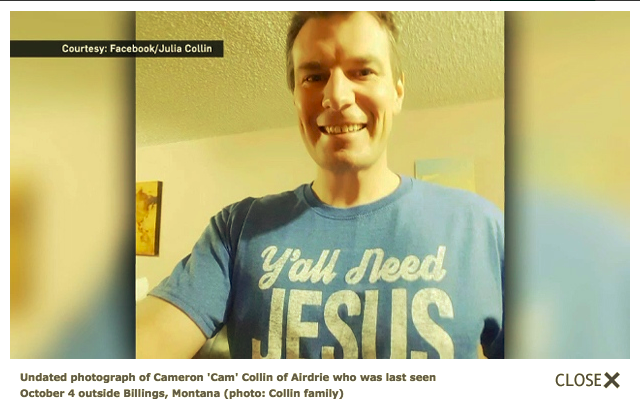 The Yellowstone County Sheriff’s Office is asking for the public’s help in locating Cameron Collin, a 37-year-old white man, who is 6’5” tall and about 200 lbs. He was last seen wearing blue jeans, cowboy boots and a black, long-sleeve t-shirt with "Affliction" on the front.