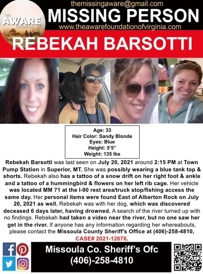 My niece, Rebecca Barsotti, was last seen July 20, 2021, at 2:15 pm at the Town Pump in Superior, MT. According to Law Enforcement, she and her dog went missing from the Clark Fork River, I 90 exit 71 rest area (Alberton Rest Area/ Alberton Rock Climbing), in Mineral County Montana on that same day. Mineral County Sheriff’s Office believe Rebekah and her dog drowned. The Mineral County Sheriff’s Office base their river drowning theory on the fact Rebekah’s vehicle was parked /deserted at the rest area and some personal belongings were found scattered on the east side of the climbing rock’s riverbank. There was later found a video of Rebekah training her dog on Rebekah’s phone recorded at this location. The last ping on Rebekah’s phone was at 3:15. A passerby claimed to have found Rebekah’s belongings on the riverbank and called MT Highway Patrol. They arrived and in turn called Mineral County Sheriff Office. The scene where Rebekah’s belongings were found on the riverbank was never secured, fingerprints were never taken from her personal items, fingerprints were never taken from the vehicle, and scent dogs were never brought in to determine if Rebekah in fact went in the river. Nobody saw Rebekah go in the river. The incident, according to the first Mineral County Sheriff deputy on the scene, was always considered a river accident and not a crime which is why those investigative measures were never taken. The Mineral County Sheriff’s Department and the Missoula County Sheriff’s Department have been working the search and rescue on the river. At one point their search efforts were discontinued but they later resumed but scaled back to twice a week. As of today, that might have ceased as well. Search crews recovered Rebekah’s dog on Monday July 26, 2021, approximately 10 miles downriver from where Rebekah’s personal belongings and vehicle were found. Further down river than they expected. No necropsy of the dog was performed Thevet said the dog was too decomposed. This is contrary to what Mineral County was stating (they were stating necropsy performed). The dog was cremated with its e-collar on because the vet claimed she could not remove it. It was discovered after cremation of Rebekah’s dog that the vet that claimed the dog was too decomposed to necropsy and the estranged husband are friends. Members of the local community formed small (primarily water) search teams daily beginning Friday 7/30/21 but even that has since scaled back due to expense and fear of repercussions. Rebekah is still missing.