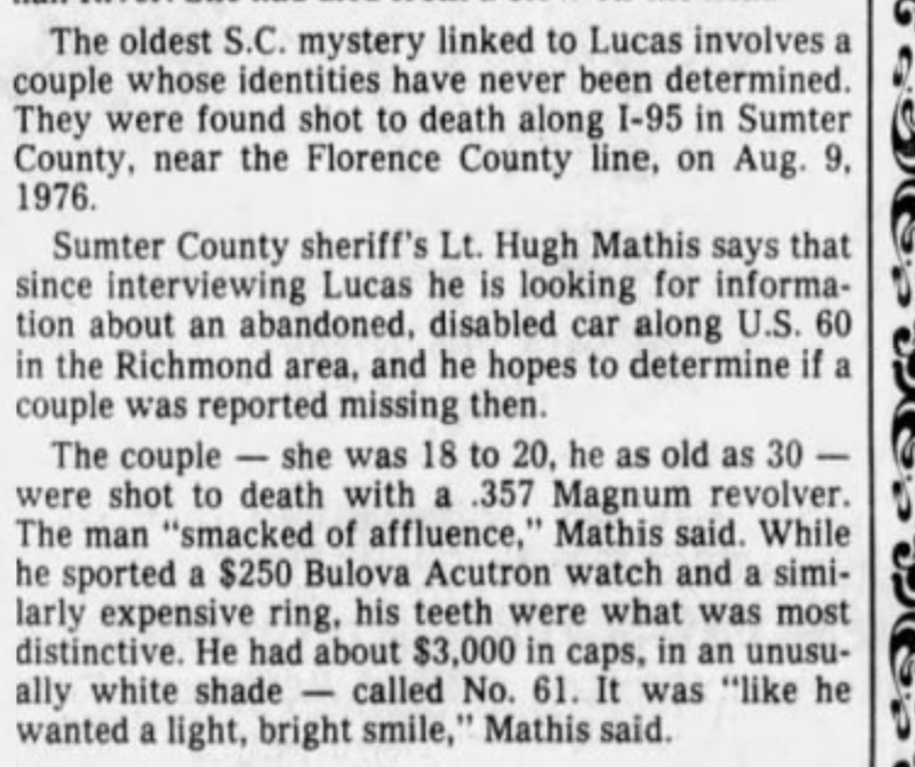 A Greenville paper had the best coverage, despite being hours across state to the northwest. That's where I saw the best compilation of old articles. One article described that the vehicle went down Locklair Road intending to go further but encountered a tall fence that prevented further travel. The vehicle then turned off Locklair into the dirt parking area of a tobacco hut. The murders occurred right there, alongside Locklair. We've seen those photos. The vehicle then backed out of the tobacco hut and sped back toward the Locklair intersection, turning left toward I-95.