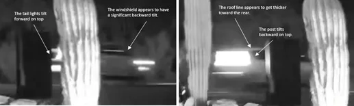 2) Then by starting and stopping the video many times to select different frames, individual frames were captured by a screen grab using a 1920x1080 pixel display and then pasted into a PowerPoint document. Figures 1 and 2 show the cropped vehicle portions of the four best frames captured.