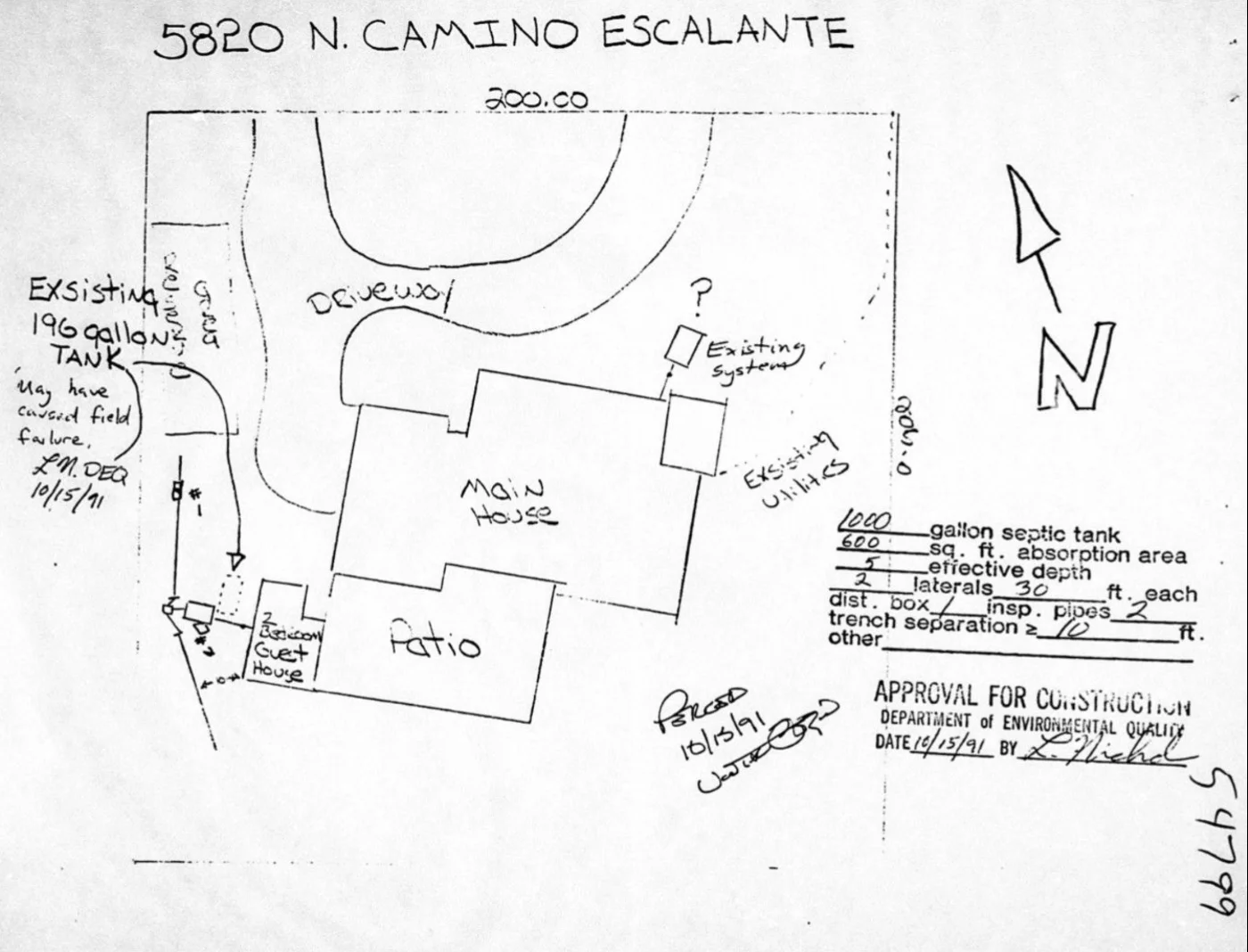 Septic/well records that were pulled for Nancy's home. They have no record of a well and state they are connected to the City of Tucson water services. For septic it looks like they had a smaller septic tank that caused drain field failure back in 1991, so they then had 1,000 gallon septic tank installed. Here is the map portion of the approved permitting paperwork if anyone is curious.