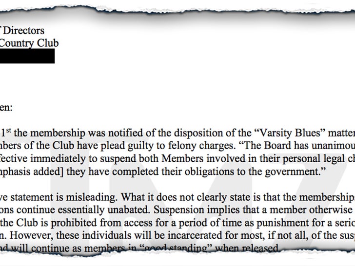 The decision did not sit well with some of the members. Past President Michael Gallagher fired off a scathing letter to the board, obtained by TMZ, in which he says ... "This unprecedented board decision to allow felons to continue as members causes irreparable reputational harm to the Club and its members."