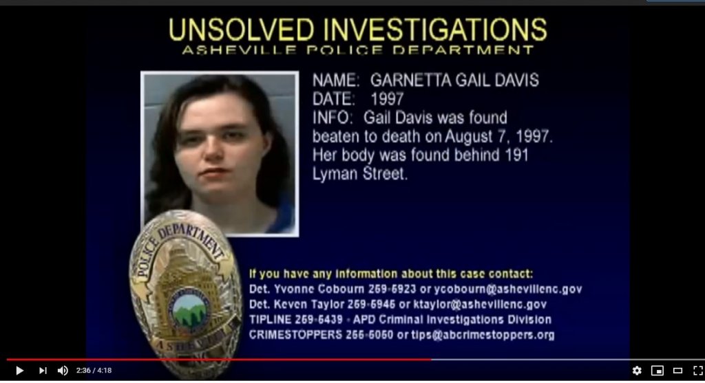 hi all at Asheville nc gail was found at lyman street beaten up she was 19 also Amber lundgren was found stabbed 2 months prior both was found on the 7th of those months strange there both found on the 7th and both lived 1 block from each other someone from linden ave or robindale ave knows something gail was my sweetheart i cant understand why both case are unsolved where the Mchahon murders from 1989 was solved 3 decades later 22 years is far to long to be unsolved Fbi should be involved
