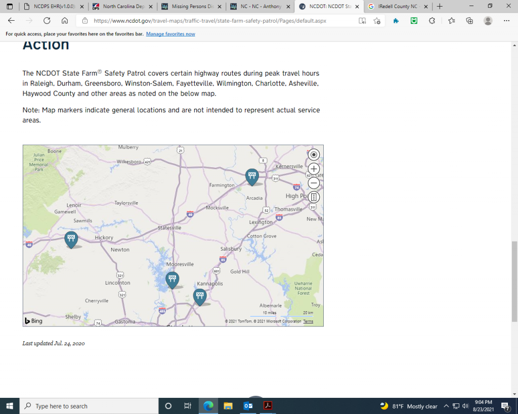 This is the official map for the NCDOT State Farm Safety Patrol for that part of NC. Wonder where exactly on I-40 the vehicle was located. Of note, cars have sat for multiple days in my part of NC with that "Special" little Fluorescent orange sticker on it before the car is either picked up by the owner or towed off. (There have been several times I have had to stop myself from writing the date on the back window in the dust and dirt.) Gotta love ENC :p