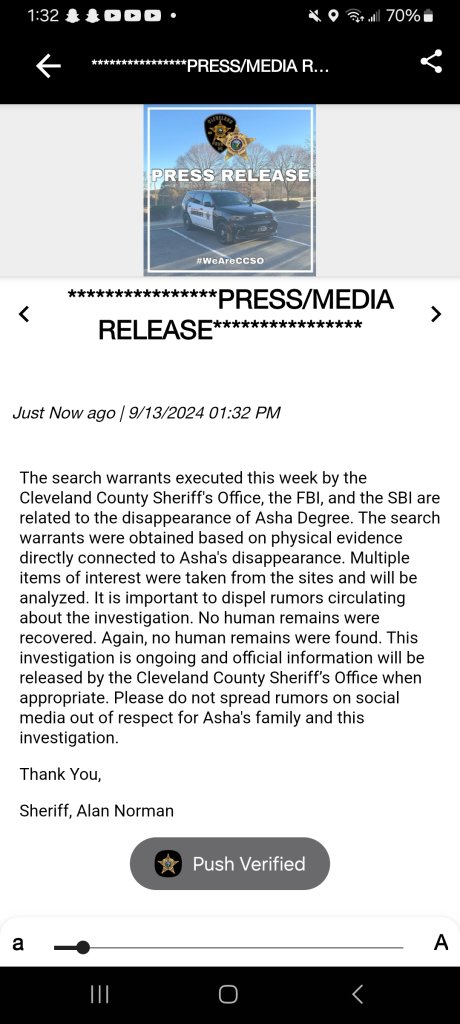 'The search warrants executed this week by the Cleveland County Sheriff's Office, the FBI, and the SBI are related to the disappearance of Asha Degree. The search warrants were obtained based on physical evidence directly connected to Asha's disappearance. Multiple items of interest were taken from the sites and will be analyzed. It is important to dispel rumors circulating about the investigation. No human remains were recovered. Again, no human remains were found. This investigation is ongoing and official information will be released by the Cleveland County Sheriff’s Office when appropriate. Please do not spread rumors on social media out of respect for Asha's family and this investigation.