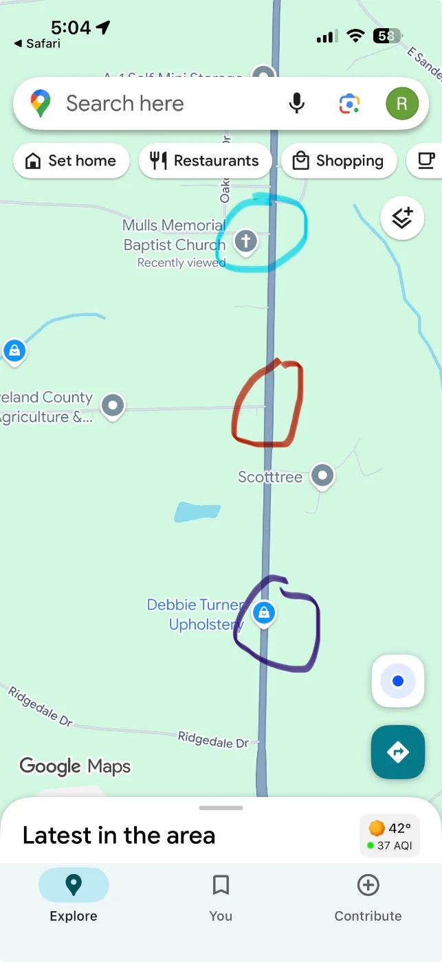 Jeff Ruppe spotted Asha around Turners Upholstery, which as most of us know, is well beyond Wallace Grove Rd and further South along HWY 18 (purple circle on map). But Jeff Ruppe isn’t mentioned as the last known sighting. This would mean that Jeff Ruppe saw Asha at a location farther away from her home than where she was abducted. The only conclusion I can draw from that, is she was walking back towards her house after Ruppe possibly frightened her. So Asha leaves home then is spotted by Ruppe around Turners Upholstery, Asha is scared and runs off into the woods before heading back towards her home where she is unfortunately abducted on Wallace Grove Rd.