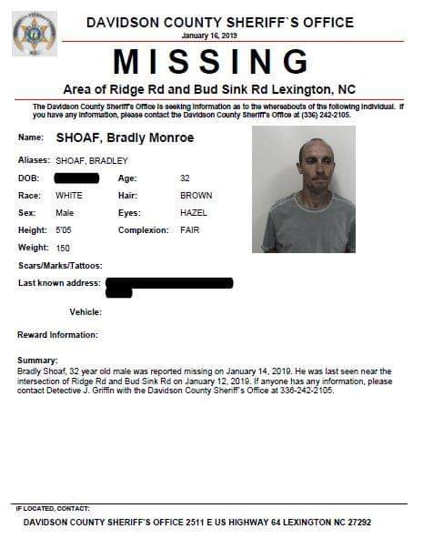 Bradley Shoaf, 32, was last seen along Ridge Road in Davidson County early Sunday morning around 6:30 a.m. Before he went missing, he was riding in a truck with two other people when the truck slid off the road and landed in a ditch near Bud Sink Road.