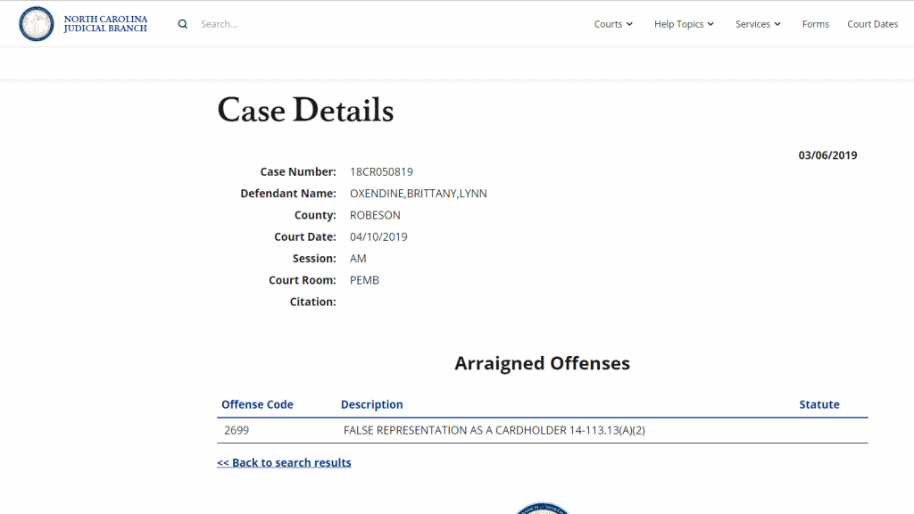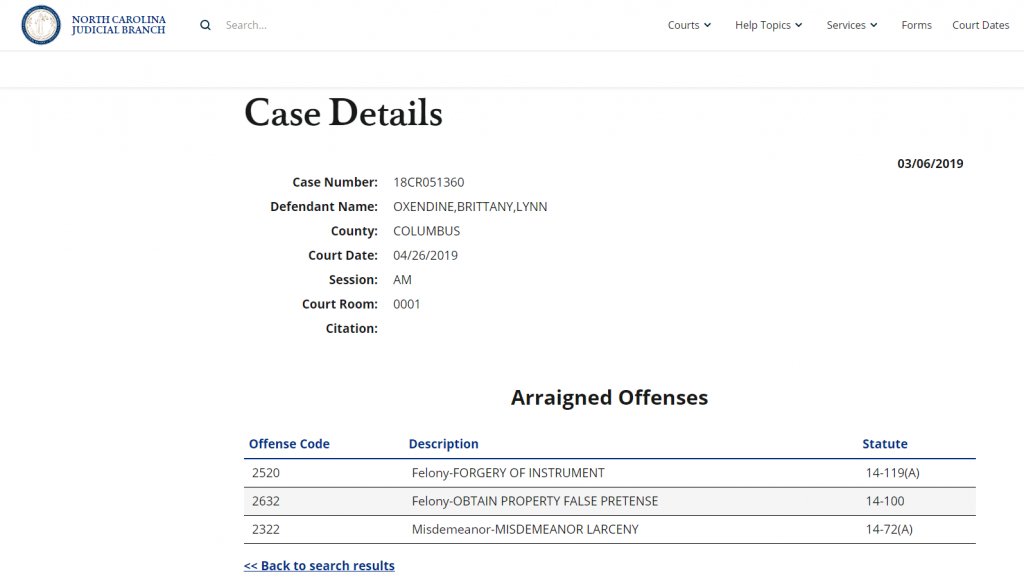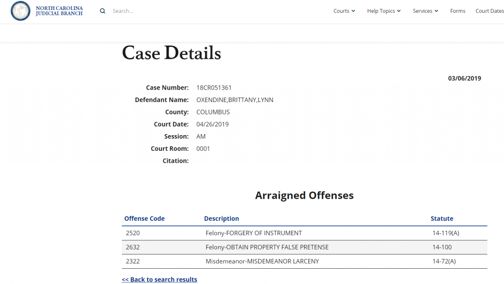 She has three current cases involving forgery, larceny, false representation of a cardholder... I'm not seeing any drug charges. Next court dates are 4/10 and 4/26.