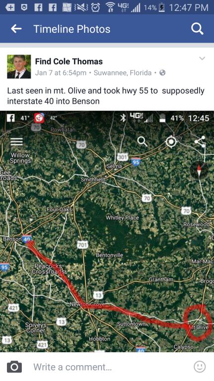 I lived in Goldsboro for 6 years and Goldsboro and Mt. Olive are Wayne County. Benson is Johnson(ville) County, I think. I would need to look back, I can understand counties sharing info. So if that video pic is indeed Mt. Olive it seems strange they shared with Benson imho...unless they wanted to let Benson take on the case since Cole was reported as last seen there.I find the information in the thread found at the second link you posted particularly helpful (I hope that it is OK that I am quoting the following FB posts, since they all come directly from the admin.; all BBM):