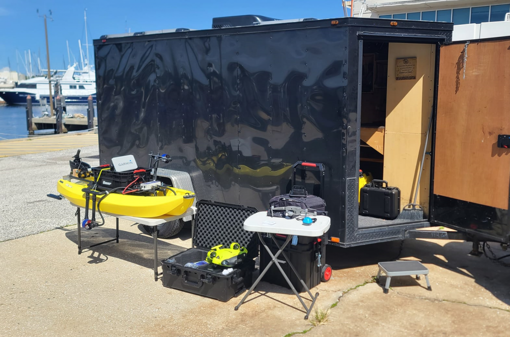 I have attached an image of my roaming search rig and some of my equipment. The RC-SSB is on the left with the yellow hull. The ROV is in the middle and is a FiFish V6. The drone on the table is my DJI Mavic 2 Pro with a Garmin Striker Cast Sonar Bobber. I use this to check a body of waters depth and contours to see if a vehicle being present is feasible. Since we are searching for human remains, the sonar dipping drone won't get much use in this case.