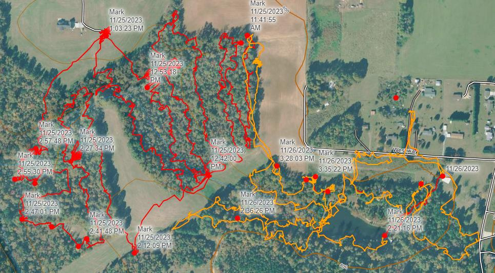 Did an extensive search of the woods to the west of Guy's property. 5.34 miles through thick woods with gully's and streams throughout. Area was clear. Marked some areas for reference and for the property owners awareness such as the location of a large fresh burrow probably for the coyote seen numerous times on the property. Very little debris in the woods. Not a single shred of clothing was found.