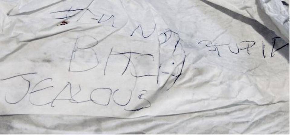 bbm: But then s/he leaves a note, which has no blood on it. Maybe the note came first and set off an argument. But no, it would have had splatter on it, being in the proximity. I can’t recall exactly where it was located, but iirc it was on the bed.