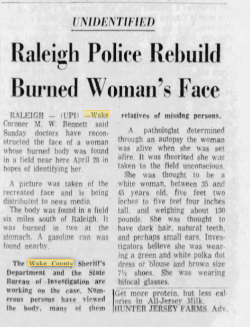 NC NC - Fuquay Varina, WhtFem 35-45, 474UFNC, burned alive, may be Canadian, bifocals, Apr'68 (Myrtle Holcomb of Florida, born in 1919)