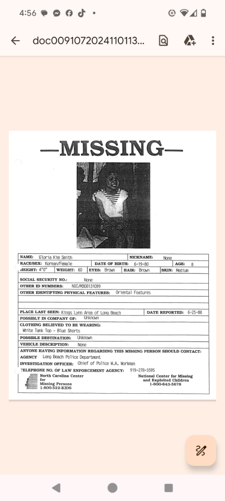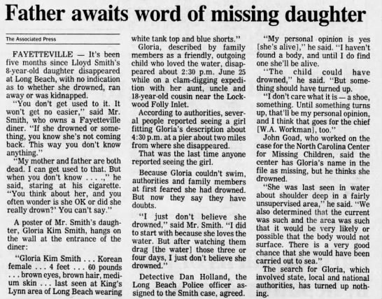 Summary: Gloria, of Fayetteville, was vacationing with family when she was last seen in waist-deep water in the Kings Lynn Drive area of Oak Island. Since her body was never recovered, officials also worked under the possibility she may have been kidnapped.