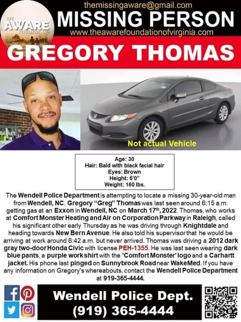 A Wake County family said they're concerned after Gregory Thomas, a husband and father of two, didn't show up to work on Thursday.