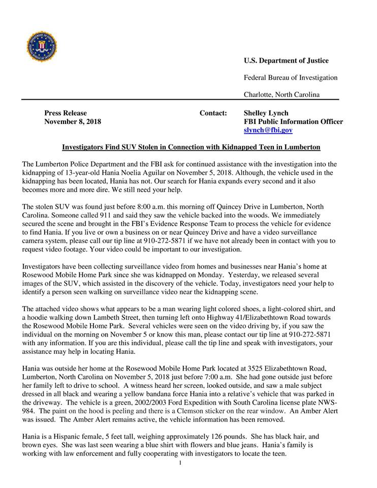 The Lumberton Police Department and the FBI ask for continued assistance with the investigation into the kidnapping of 13-year-old Hania Noelia Aguilar on November 5, 2018. Although, the vehicle used in the kidnapping has been located, Hania has not. Our search for Hania expands every second and it also becomes more and more dire. We still need your help.
