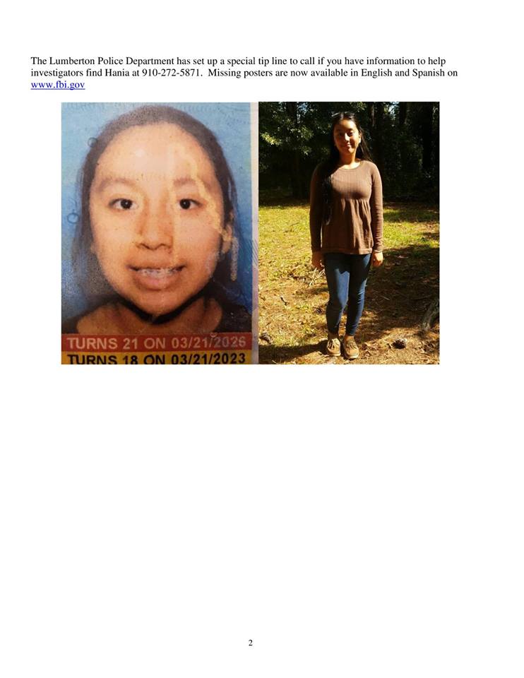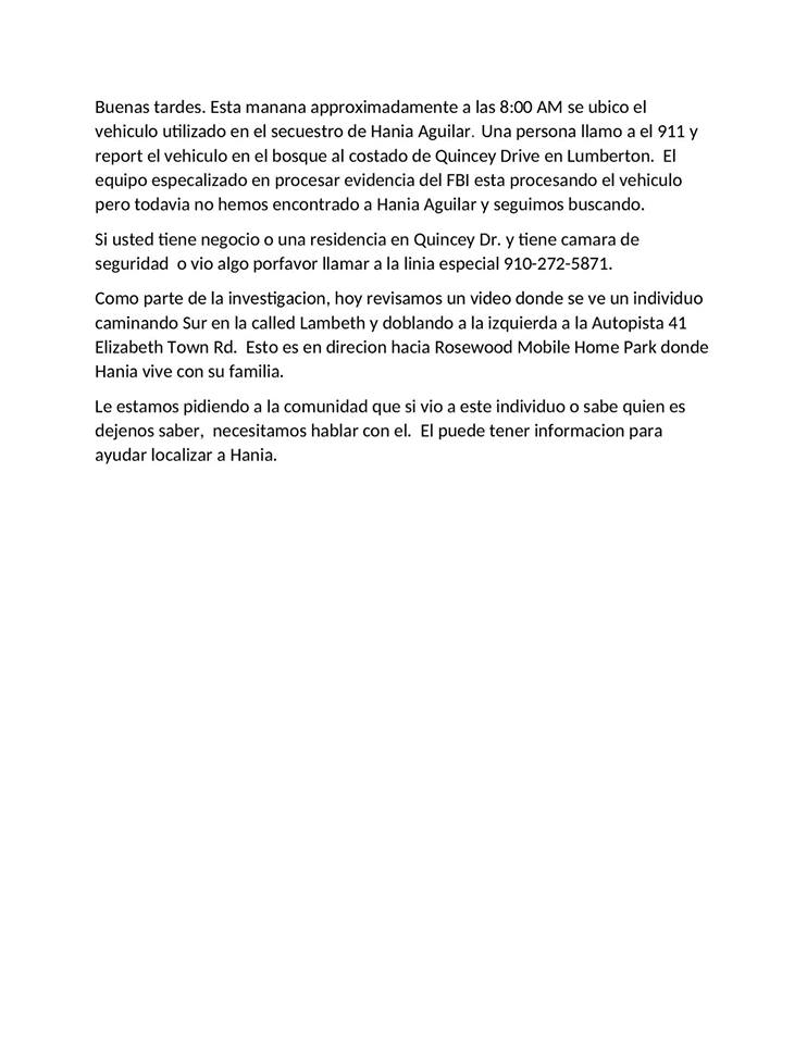 The Lumberton Police Department and the FBI ask you not to spread rumors on social media about the search for Hania Aguilar. Information about the intensive search for Hania is being released by our official channels on a regular basis. Do not be responsible for redirecting our efforts away from where they need to be.... we should all unite to #FindHania.