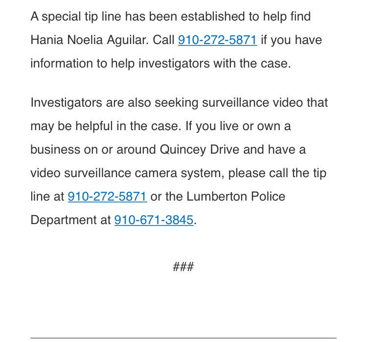 DAY 5 in the search for #HaniaAguilar, 13, who was kidnapped from Lumberton. I just talked to her family priest, Rev. Giovanni Romero, who says they’ll have a vigil to pray for her safe return tonight at 7p at St. Andrew Catholic Church, 301 Mercer Avenue, Red Springs. #ABC11