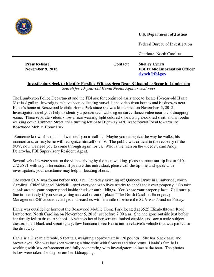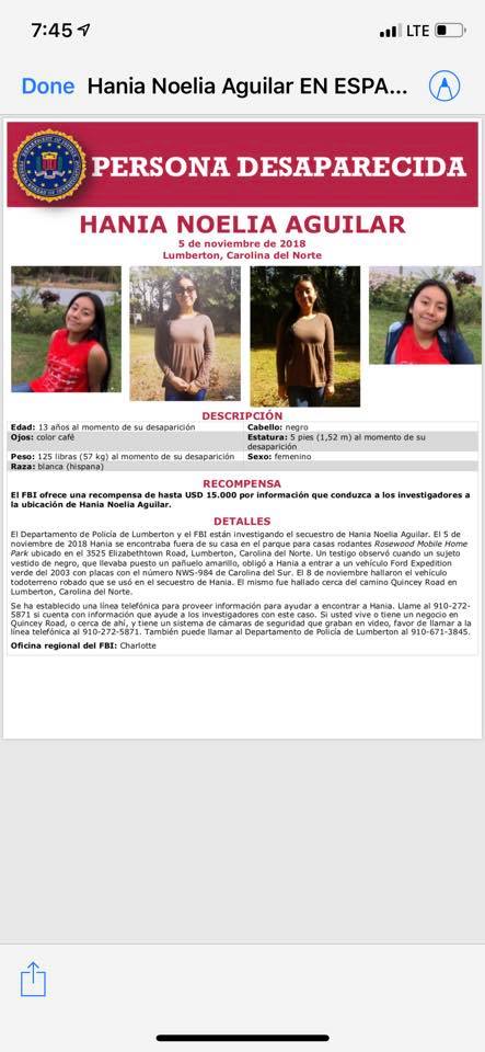 “Our search has for Hania is expanding every second, and it’s also become more dire now. The stolen SUV used in the kidnapping of was found just before 8 a.m. this morning off Quincey Drive here in Lumberton, North Carolina. Someone called 911 and said they saw the vehicle backed in the woods," said McNeill.