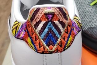 They are Adidas white sneakers with black stripes and have a colorful stitching on the back heel of the shoe.