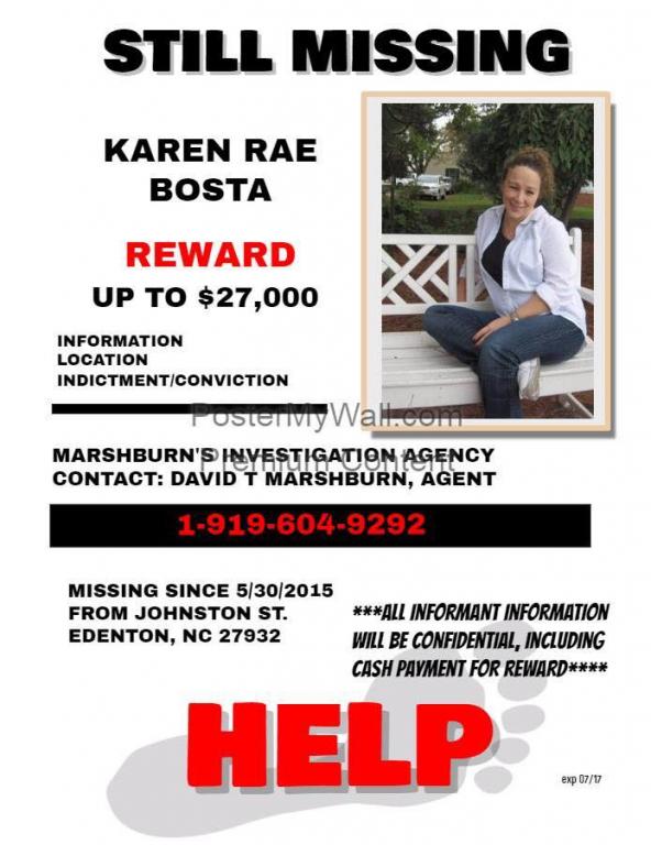 I knew about the reward, but I wasn't aware a private investigator was working on Karen Bosta's case. David Marshburn, 919-604-9292. I believe this is the same PI that found Kelli Bodreax.