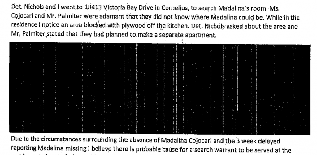 One more thing about the redacted search warrants (see link below). Right under the part about the plywood partition that was observed in the kitchen, (which the parents said was related to making an apartment) there is a large redacted section. (See below screenshot) Is that strange plywood partition in the kitchen related somehow to Madelina's disappearance? Just opinion and speculation.