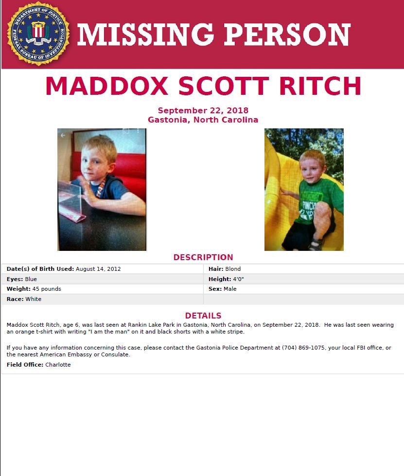 WSOCTV reports that Maddox Ritch disappeared around 1:30 p.m. Saturday while with his family at Rankin Lake. Family members stated they last saw him at the park area with his dad and another adult when he wandered off on his own, according to authorities.