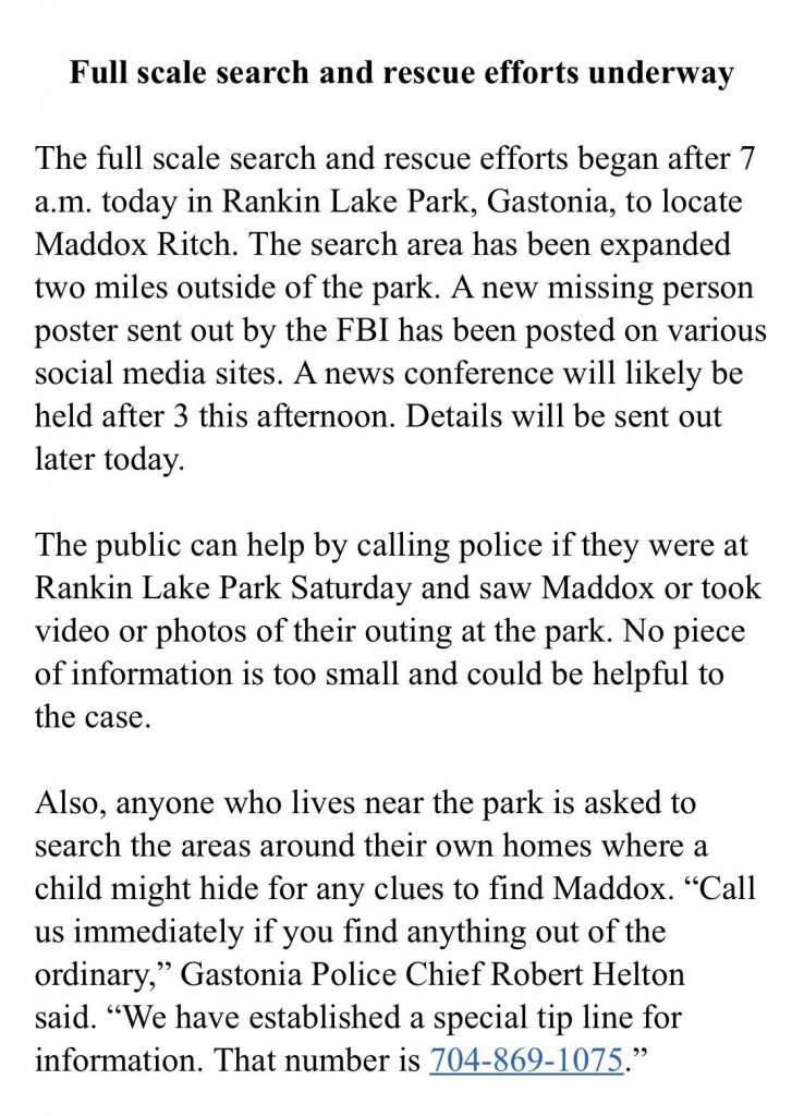 ‘NEW: The full scale search and rescue efforts began after 7 a.m. today in Rankin Lake Park, Gastonia, to locate Maddox Ritch. The search area has been expanded two miles outside of the park. #WBTV’