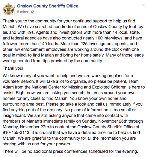 Onslow Sheriff Hans Miller was asked at a press conference Tuesday afternoon if people would be able to conduct searches to help and at that time no options were available other than feeding and caffeinating the law enforcement officers, firemen, and military members who had boots on the ground or were flying helicopters searching for Mariah.