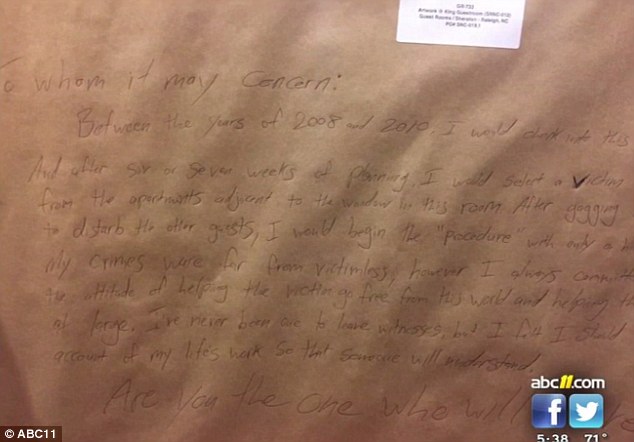 "What appears to be a 'murder confession' was found by a contractor renovating a hotel room in Raleigh, North Carolina.