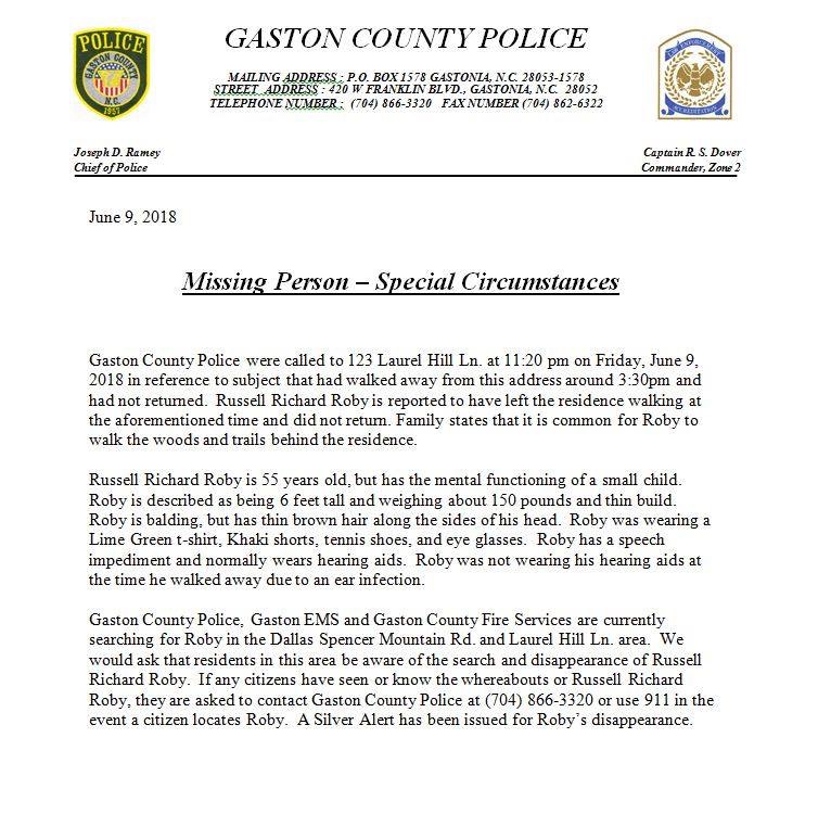 Anyone with information on the disappearance of Russell Rob is asked to call the Gaston County Police Department at 704-866-3320.