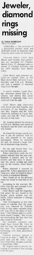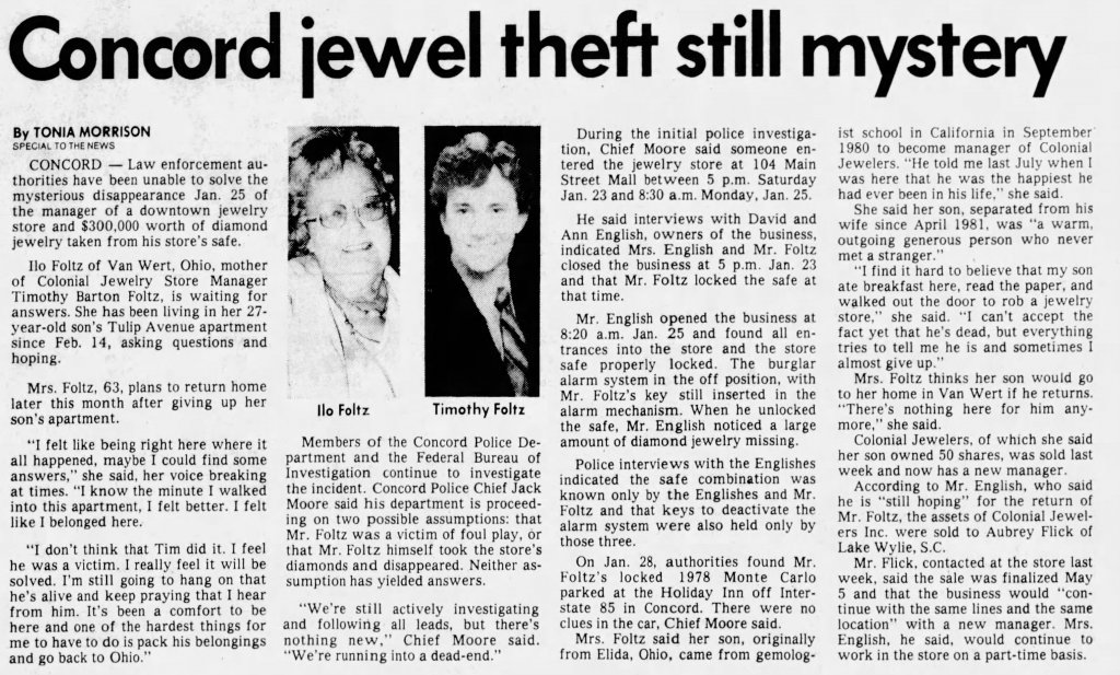 Circumstances of Disappearance He did not report for work on Monday 01/25/1982. His car was recovered on 02/28/1982 at the Holiday Inn in Concord, NC. When the business was opened, the partner discovered that $295,000 in diamonds were missing.