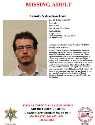 Deputies say Trinity Fain was last seen leaving his home on Puckett Road in Westfield two weeks ago. He was last reported to be at his job in Mt. Airy on Sunday, Feb. 5. The sheriff's office says the following day, his vehicle was found on Puckett Road, about a mile from his residence.