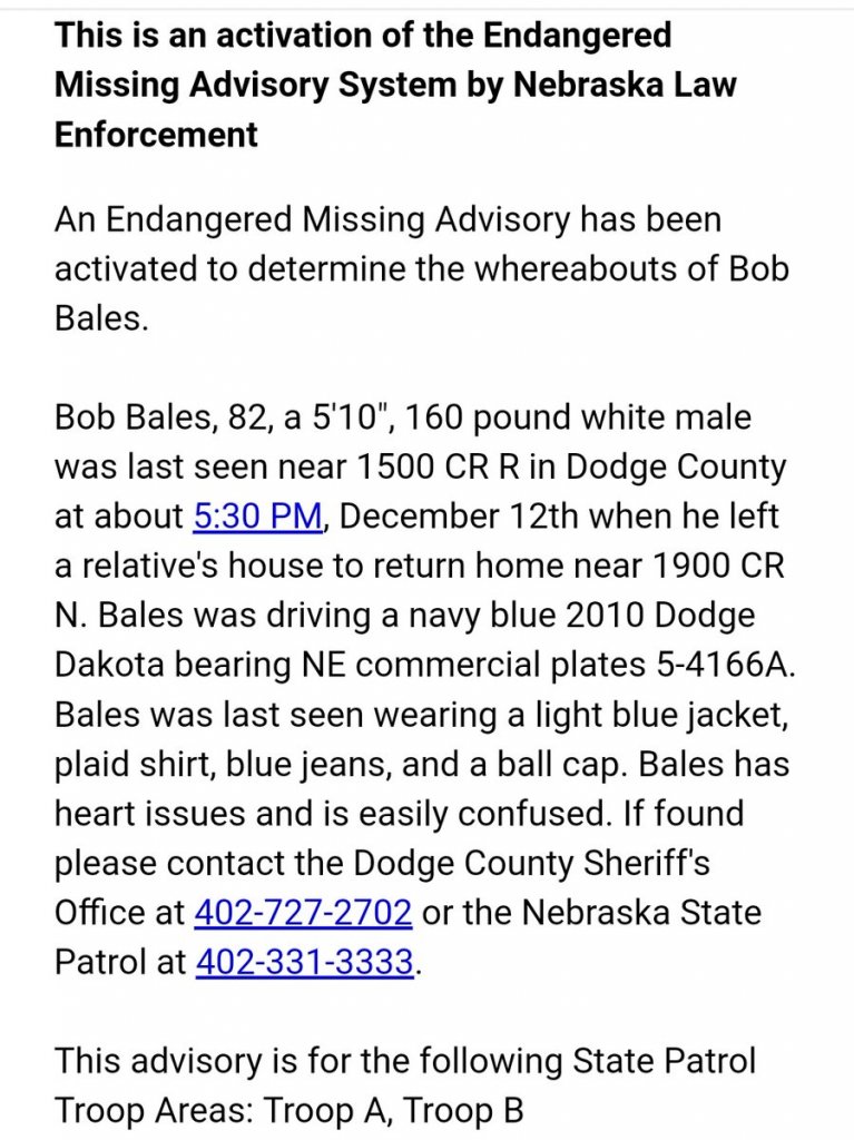 If you have any information please call the Dodge County Sheriff's office, or Nebraska State Patrol at the numbers listed below;