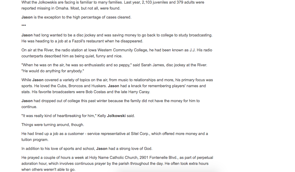 This is an article from the Omaha World Herald from July 2001. It was when he was gone for a month. Probably the best article there is about the case.