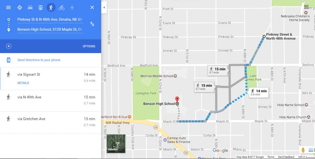 I'm sure this has been posted before but here's directions on Google Maps from Jason's home to Omaha Benson High School showing the most expedient walking route. Does anything stand out to anyone?