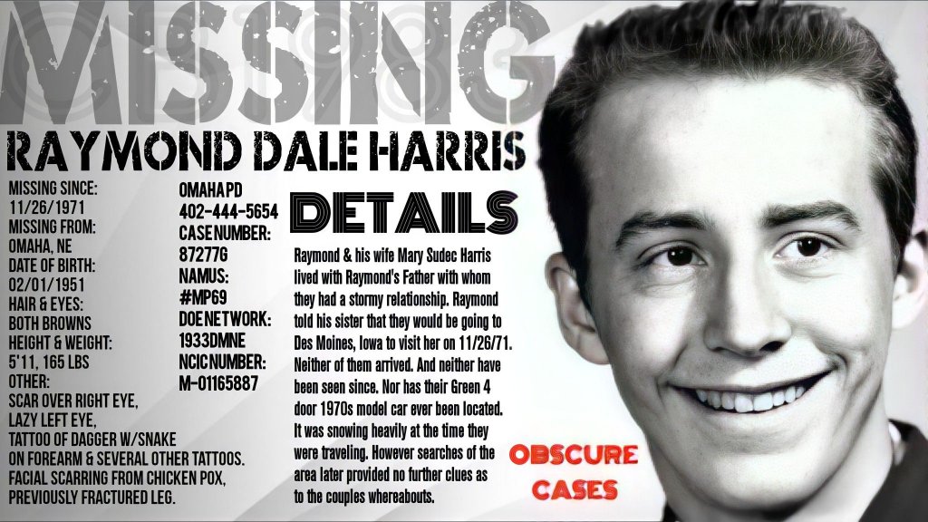 Raymond and his wife of one month, Mary Sudac Harris, told his sister that they would be traveling to her Des Moines, Iowa residence on November 26, 1971. Raymond and Mary lived with Raymond's father at a residence in the 600 block of south 27th Street in Omaha, Nebraska at the time. It has been established that the couple had a stormy relationship with Raymond's father, and Raymond informed his sister that he and his wife planned to move out of his father's home. They never arrived at his sister's home and have not been heard from again. Their vehicle, a green four-door 1970s model Chevrolet, has never been located.