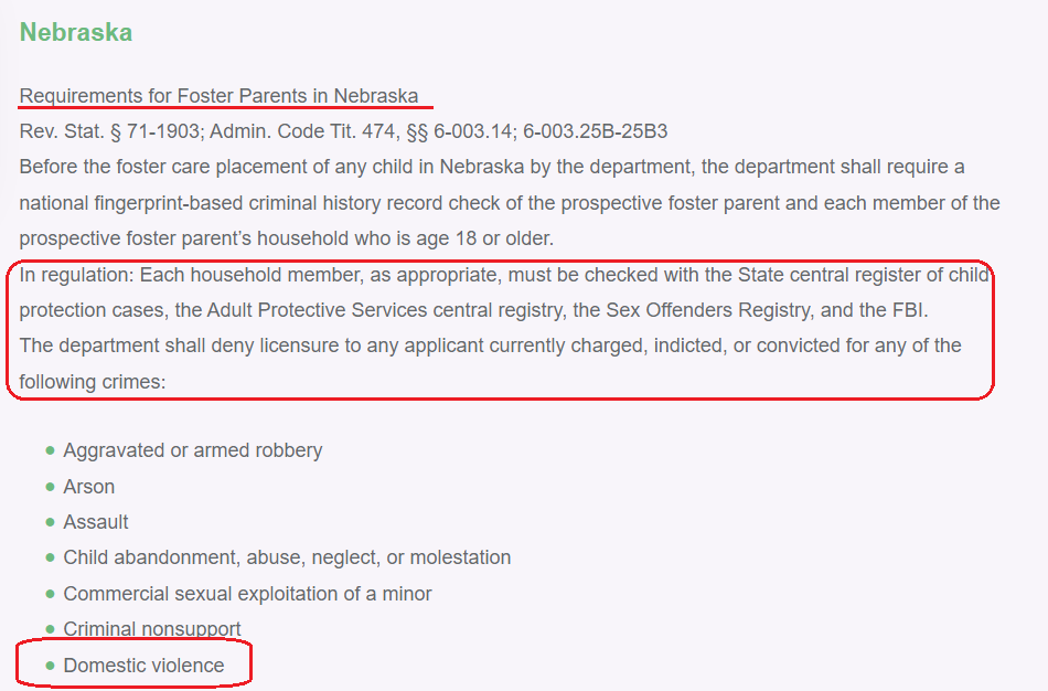 Note: this is for foster care, not adoption (perhaps they're regulated the same?). I can't easily find rules for adoption in Nebraska. I would be amazed that they let someone even charged with domestic assault adopt a child. Anyone know whether the adoption happened after the 2014 domestic assault court case?