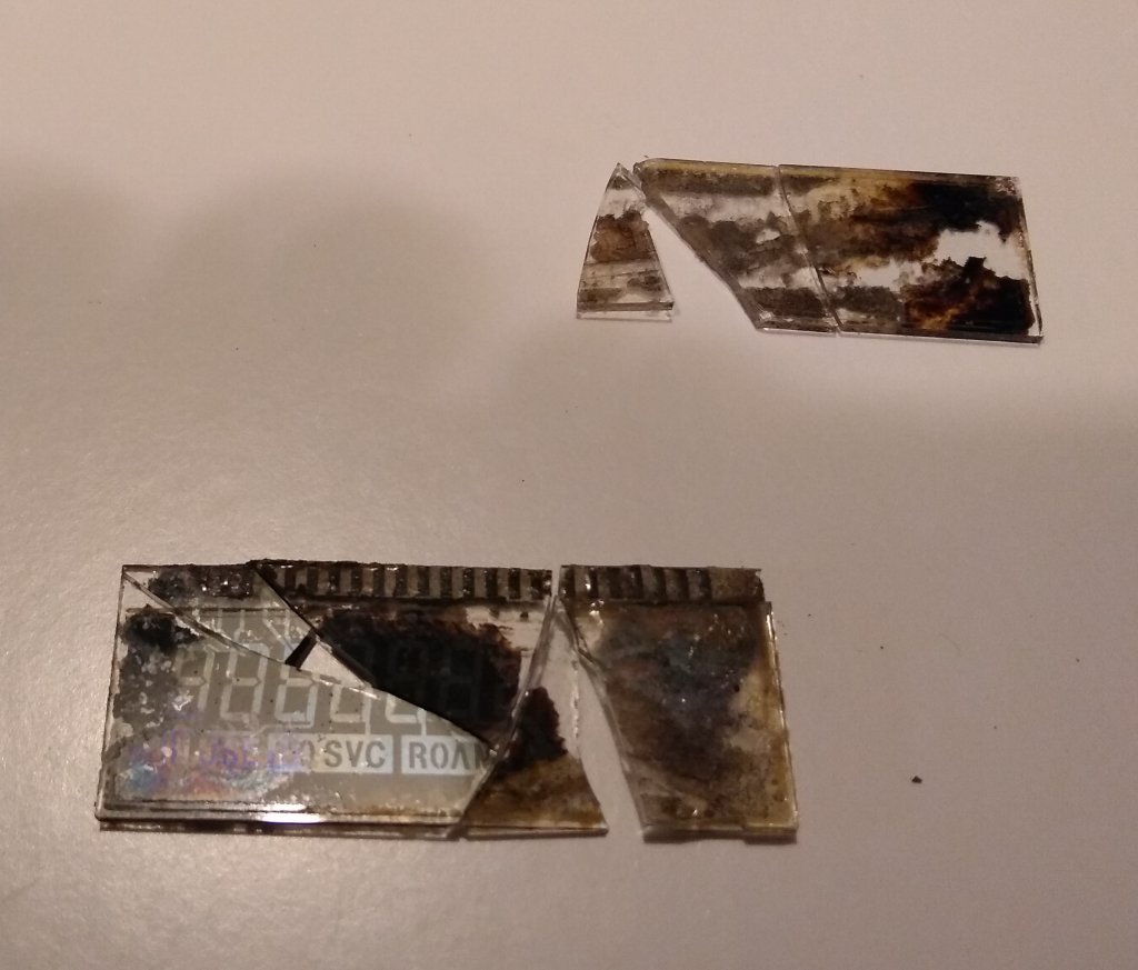 It looks like the phone had two lenses. The upper pieces don’t have any identifiable LCD characters, but the larger and somewhat thicker lower pieces do. They both have fire damage residue on them which block out some possible identifying characters, but I don’t want to chip the burn residue away for concern I might also rub off other characters. The upside down V used in the word "roam" reminds me of 1990's cell phones, as well as the "no svc" characters.