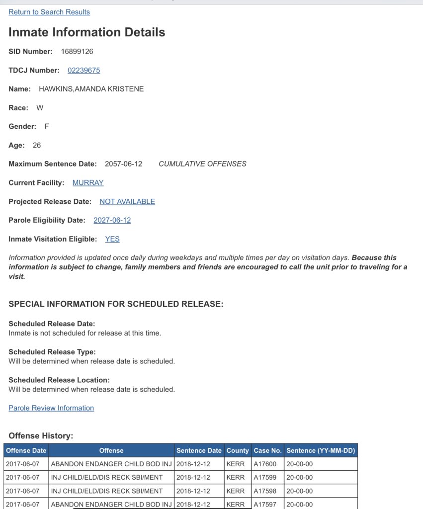 *Arraignment Hearing - TX - Addyson Overgard-Eddy (2) & Brynn Hawkins (1) (June 9, 2017) (left in car overnight) - Amanda Kristene Hawkins (19) "mom" arrested & Grand jury indicted on charges of 2 counts of child endangerment & abandonment ($70,000 bail); pled not guilty; hot car deaths; addtl charges coming - like murder!