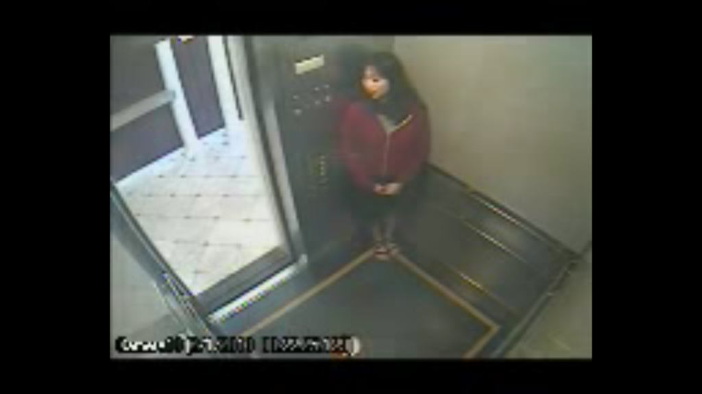 And this is most puzzling aspect of the video. If watching the original slowed down version, at 0:33, the moment Lam stood at the lift buttons corner and we can see almost her full face, the right half of her face breaks into a blur, almost exactly down a center line. This does not occur on any other parts of the video. Then as she moved forward at 0:37, you can see distinct pixelation of her mouth. The blur follows the right half of her face.