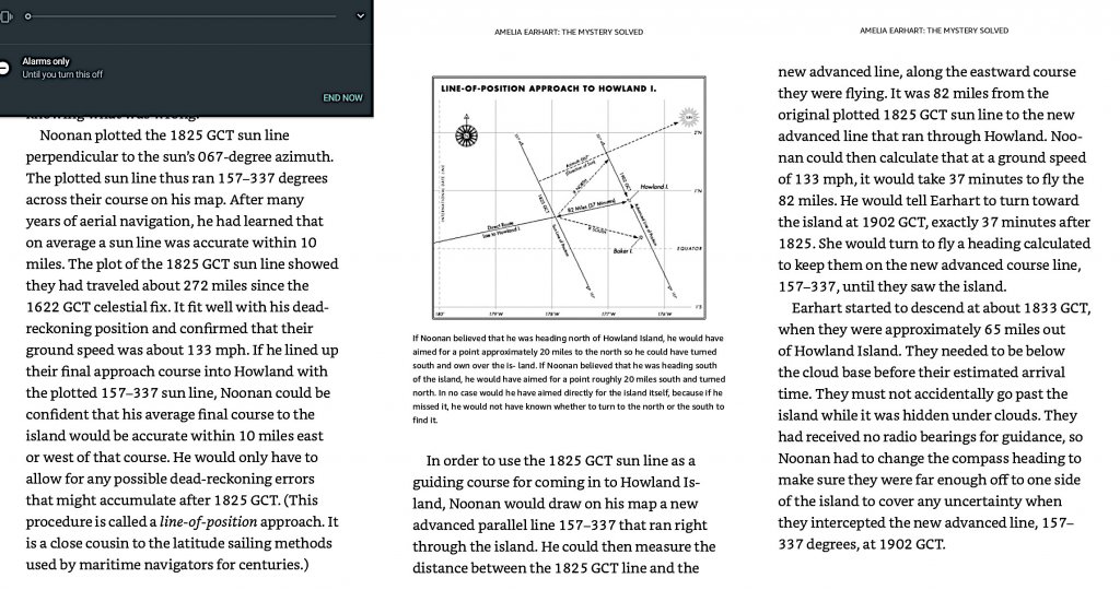 I'll attach a screenshot from the kindle edition of Elgen Long's book; it explains the "running on the position line 157-3whatever"--which, you'll note, I failed rather badly at explaining. I'm using the screenshots under the assumption of "Fair Use," and I still encourage everybody interested in AE to buy a copy. I have a paper copy but also bought it again when I got an e-reader. Excellent source of information, particularly concerning the actual times of events, which are confused in some other accounts. --kk (edited to add, Noonan used this technique a number of times in the flights documented in the book, and a general accountof the method is probably given elsewhere in the book, if this doesn't explain it.)