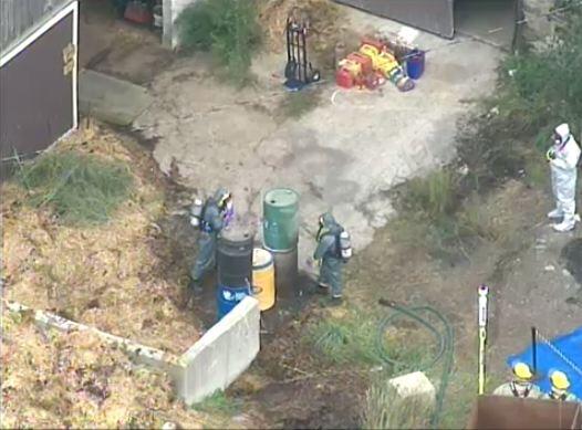 I am not so sure you would need 100 cops, 3 hazmet trucks, an ambulance firefighters, firetrucks and forensics just to deal with some old farm chemicals and sprays. That would be overkill.