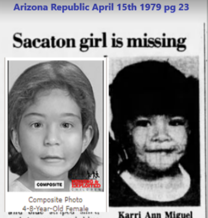 I've been trying to rule out this Girl ; Karri Ann Miguel from Sacaton Arizona Missing since April 4th 1979. Wanted to run this past this group Have been working this a little so far . Apparently isn't in the NAMUS db from what someone had told me.