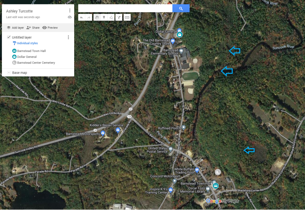 In comparison to the Dollar General (top of map), Ashley being recovered on New Road (bottom rt) is very near her vehicle (parked at Town hall).