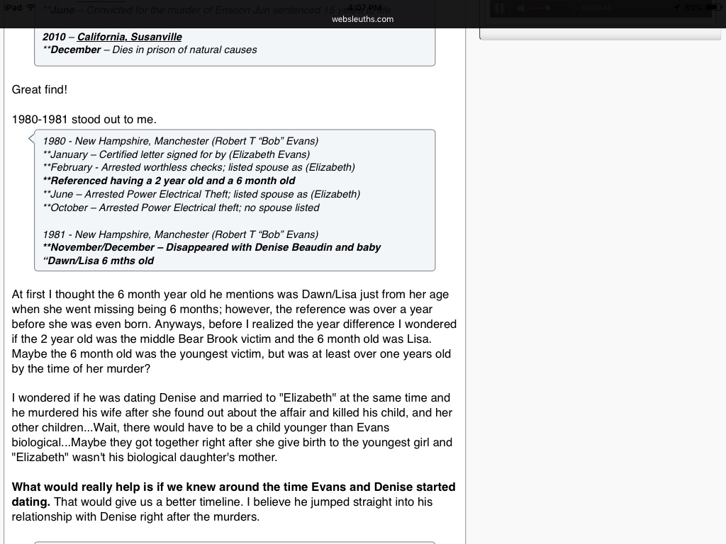 I love the timelines..i really needed that!ive got notes everywhere.just a,few random thoughts of mine..he told people he went to school in Arizona.i def think theres some truth in most lies,but I can't help thinking of his distinct accent that has been noted.to me,I feel like maybe he comes from MA,NY,etc.and although this is,a huge case,I just don't think his picture is really out there.i say this for a couple reasons.we here at WS of course,live for these stories,so our interest was piqued.however,most people I talk to about it have no clue .even my ex,who recently retired as a homicide detective in WI,hadn't heard of it.im assisting in investigations for an Illinois Missing Persons group,and the founder never heard of it.I just feel that SOMEBODY will see his pic,have an eureeka moment ,and everything else will fall into place .lastly,I'm wondering how intense of a search of Bear Brook was conducted in 2000?could Denise be there ?