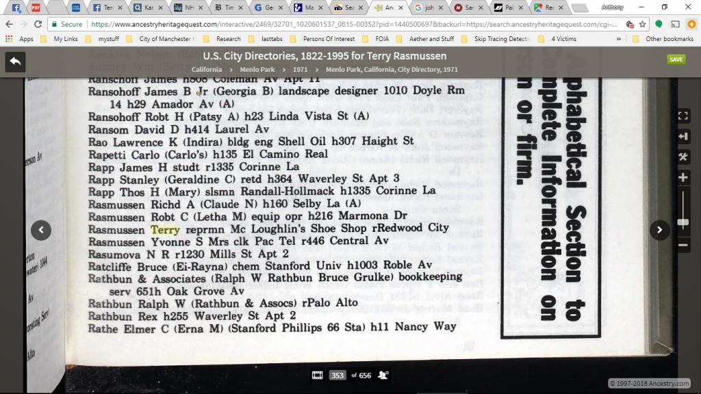 Correct me if I am wrong, TR resurfaced in 1984 in CA but it's unknown when he actually arrived in CA. My understanding is that his whereabouts are unknown until from Nov. '81 in NH until 1984 in CA.