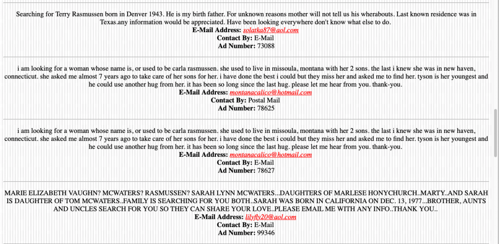 eta, adding link to lost family message board mentioned earlier. They don't show up on Google search. Put any search term in the search box (it says to enter family name.) I found a couple messages about missing mothers/children. I'm sure there are more.