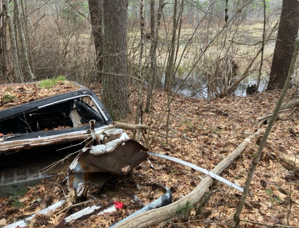 The white vehicle I posted yesterday appears to be 1965-1968 Ford Galaxie 500 XL. It’s unclear when it was ditched in the woods, yet let’s assume mid sixties to early/mid 70s. That’s ten or so years of car ditching opportunity. The 69 Oldsmobile borrowed by Eddy was ditched in July 1977. So if someone were to ditch a vehicle in that area they’d need to have some knowledge of the geography, favorable weather conditions, and precise knowledge of the off-the-beaten-path location of the final destination. Most of the trails in that area (present day) are compact soil and peat gravel. If you have an especially wet season you would conceivably get stuck very easily. It looks like prime times for dry trails were 1963-1969, 1971, 1975, and a small sliver of 1977 based on drought conditions in NH. Neither an Oldsmobile nor Galaxie are off-road vehicles. They’re low to the ground and heavy (a Galaxie is 3500-3700lbs). Most of the terrain is downhill, yet the initial sections and between miles 1 and 2, you’d have to climb. Another observation (from current day) is that people do visit this area. I found a red solo cup and empty bottle of wine in the vicinity of the Galaxie. Perhaps this may have been a well known spot in 60s and 70s too among those who partake in libations in the woods.