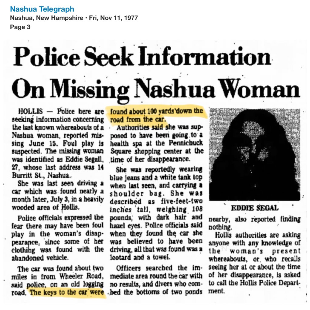 I recently stumbled upon this podcast that also covers another missing person across the border in Massachusetts, a month prior. Deborah Ann Quimby disappeared in May 1977 in Townsend. She was 13 at the time. Townsend is 10 miles from Hollis. There’s some interesting theories about the relationships among a cluster of cases in this podcast. I haven’t listened to it yet.